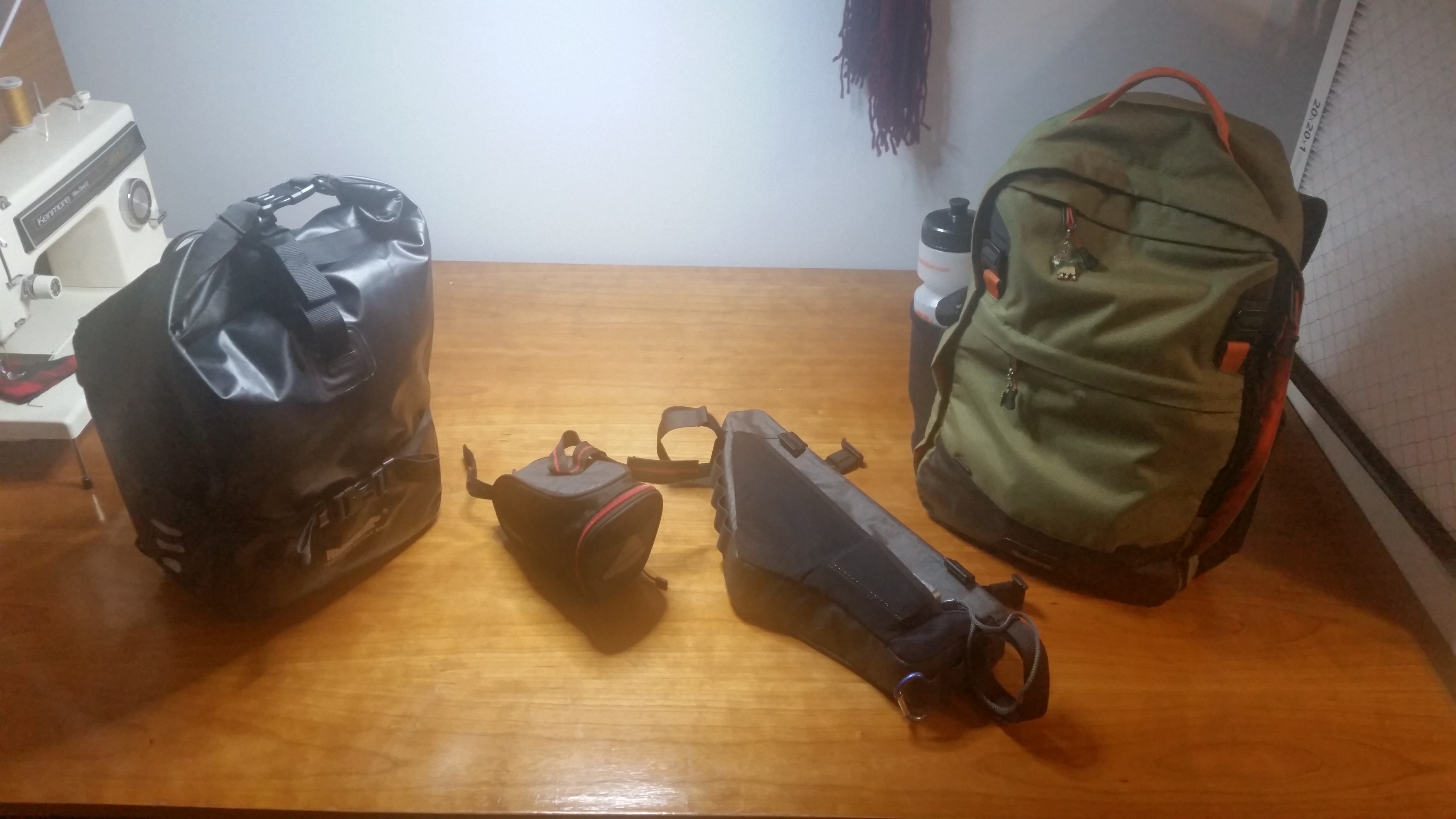 So naturally, I’m going to share the little touring setup I came up with for this trip. Here are all my bags, taken off the bike at the end of the tour.