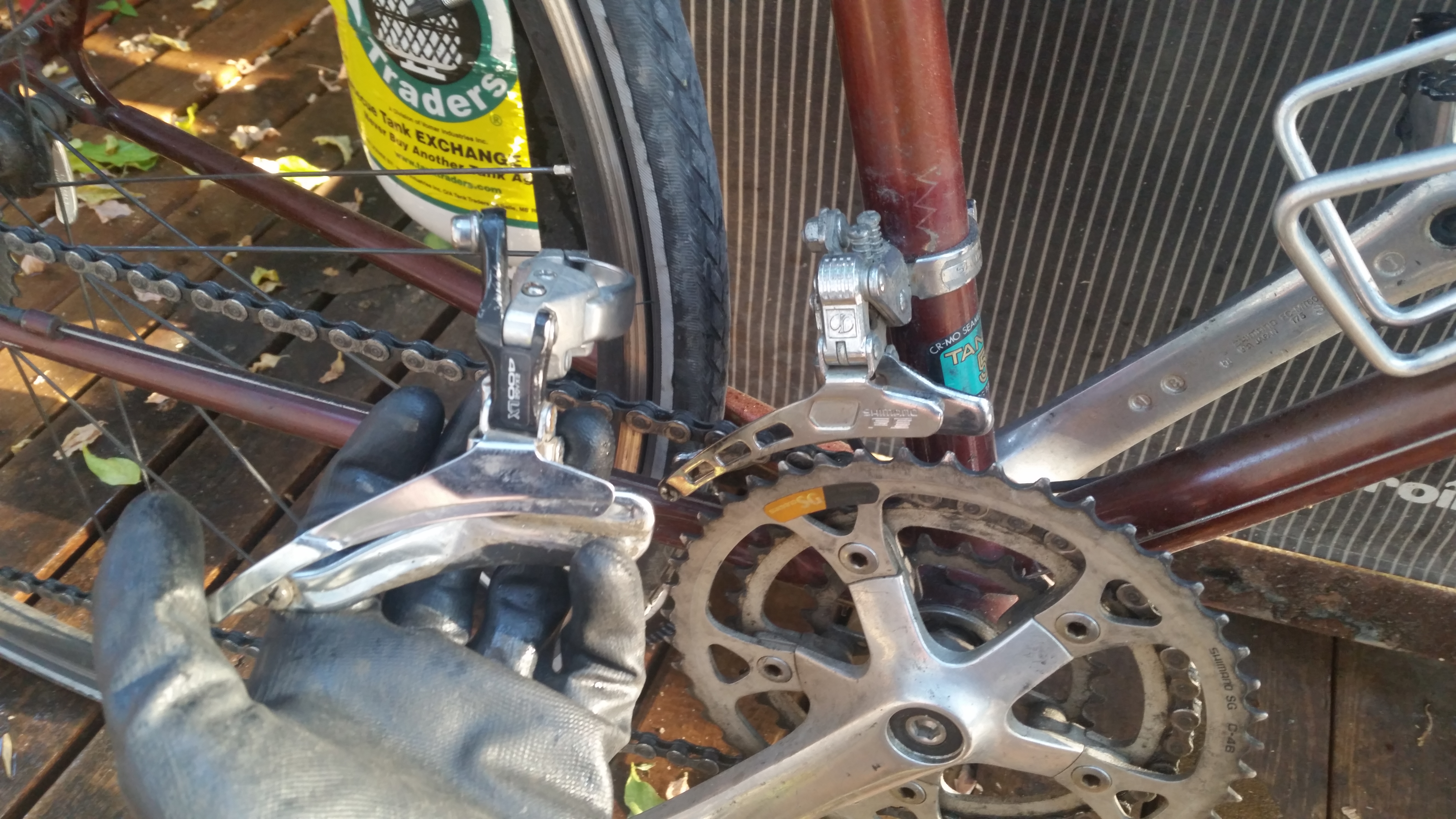 Another thing I didn’t really anticipate was an issue with the front derailleur. I had an old one from a vintage bike that seemed like a good fit. Since I was using friction shifting rather than indexed, I didn’t think it would matter that it was designed for a 2x front chainring.