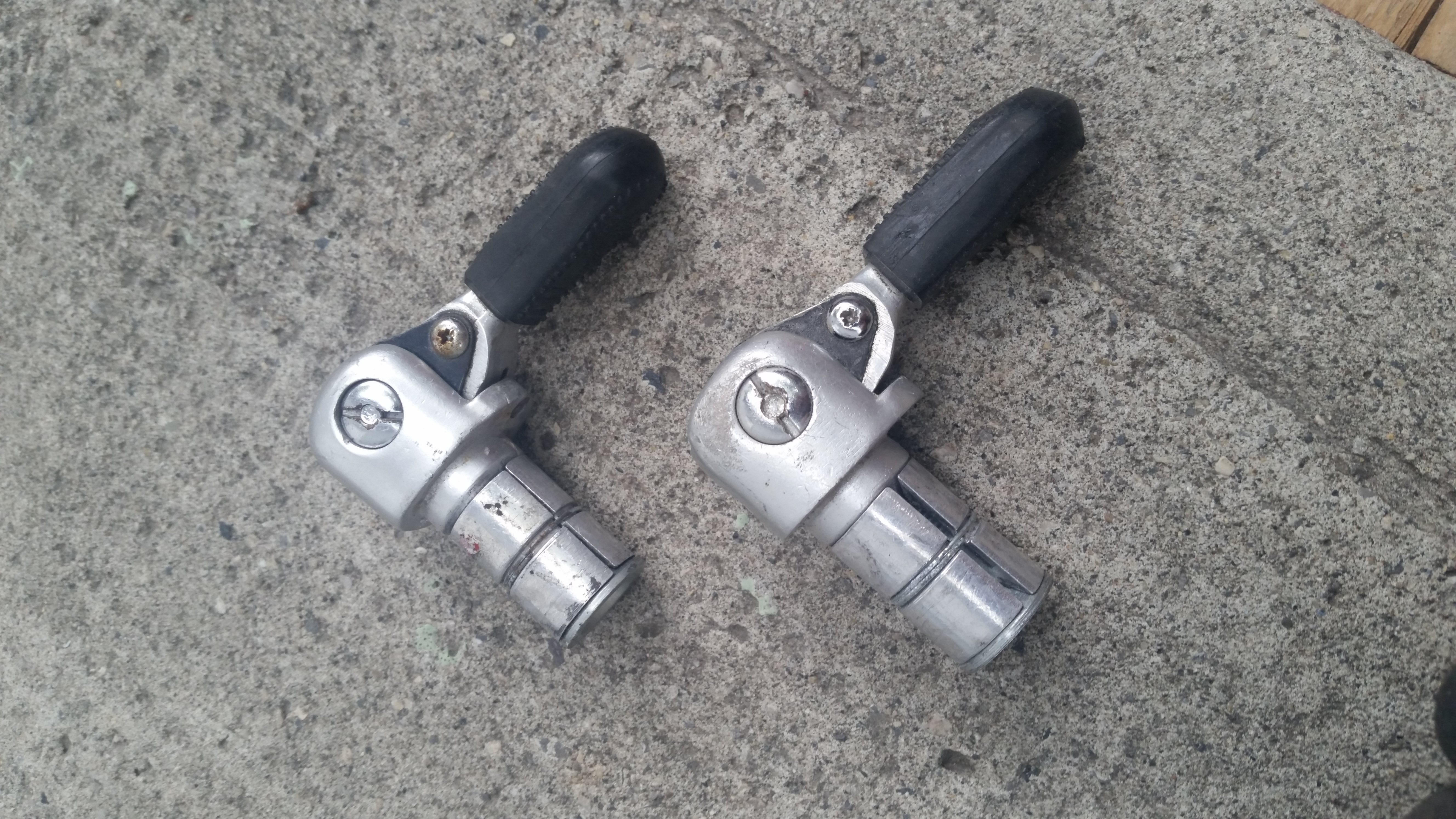 Up until this point, I was using one single bar-end friction shifter, and a mismatched stem-mounted friction shifter. Shifting was awkward, and I had been looking all over for a half-decent set of bar-end shifters. These were surprisingly hard to find! There were none at my local bike co-op, and buying new ones would have easily cost more than everything else on the bike.