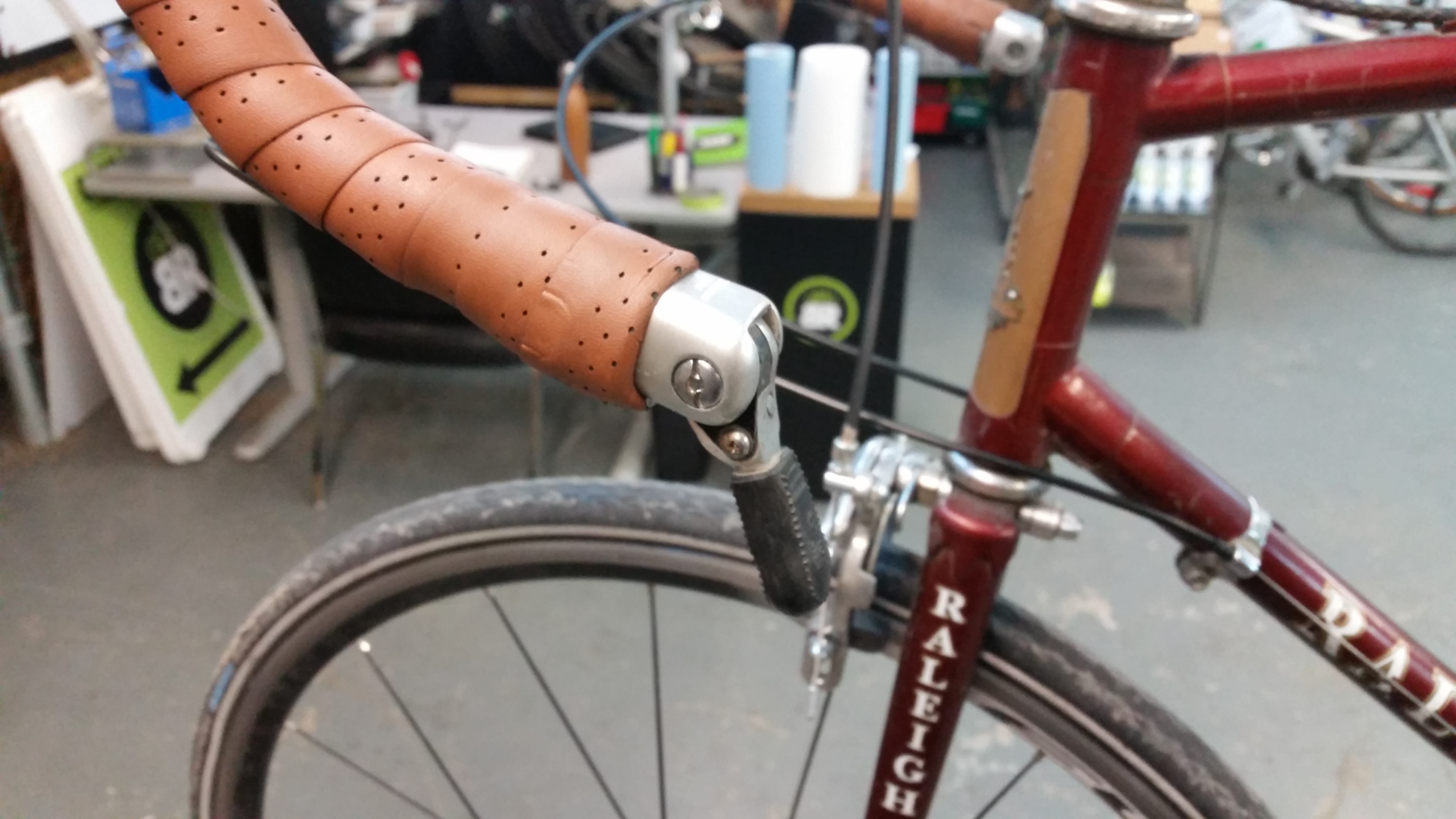 I also noticed that, unlike modern bar-end shifters, the left and right shifter are exactly the same. They also make a very satisfying ratcheting noise when the cable is pulled. A vintage bike should have quirky little joys like this.