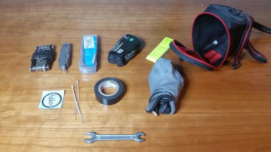 I keep anything bike maintenance related in a seat wedge pack. This includes a multitool, a patch kit, a swiss army knife, a spare tube, some zip ties, a spanner, electrical tape, and some gloves. I have a small bicycle pump that almost fits in this pack. Can’t have everything, I suppose.