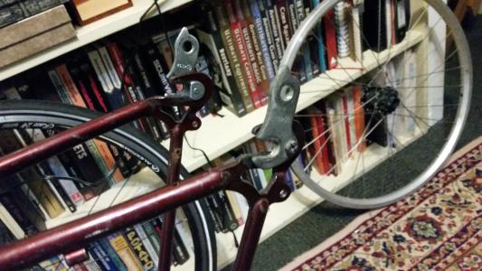 Another issue with vintage bikes is that they have horizontal dropouts. Derailleurs from this era are mounted claw-style, without a derailleur hanger. For the first iteration of making this a functional bike, I just grabbed a vintage derailleur and stuck it on, but eventually I was able to find claw-style derailleur hangers that could fit modern derailleurs. I’d highly recommend these - in some ways they’re more convenient than modern derailleur hangers, due to their near-universal compatibility.
