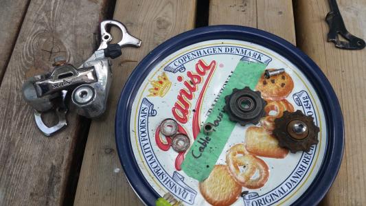 For the actual drivetrain, I used old (90s - 2000s era) mountain bike drivetrain parts. This is mostly due to the fact that I find the gear range more agreeable. Road bike parts tend to have a LOT of gears with very little difference to keep your optimal cadence. Mountain bike parts tend to have wider gear ranges and lower gearing overall. But a significant factor is the prevalence of mountain bikes where I live. Mountain bike parts are good, plentiful, easily accessible, and cheap.